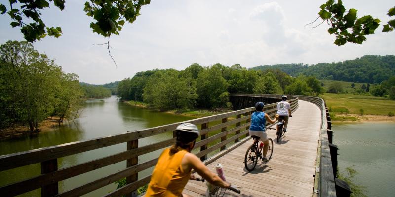このトレイルにはカメラをお忘れなく。 以前は鉄道トラックだったバージニアクリーパートレイル(Virginia Creeper Trail)は、バージニア州南西部の田舎の絵葉書のように美しい景観の中を通過しています。 このトレイルは、2015 年にレイルツートレイル殿堂入り(Rails-to-Trails Hall of Fame)を果たしており、あらゆる年代や体力のサイクリストに人気です。